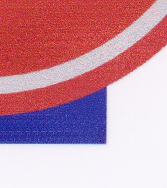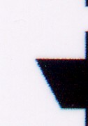 De eerste scan is een uitvergroting van de hoek van het Hardwareinfo.net logo op 600 dpi. Het betreft een stuk rechte lijn, een stuk cirkel, en een directe overgang tussen wit, rood en blauw. Hier kan men goed zien hoe de printer zich redt met lijnen, cirkels en aan elkaar grenzende kleuren. Ook het printen van egale kleurvlakken wordt hier getest. Er kan beoordeeld worden hoe de dithering werkt (is er veel last van puntjes e.d.).