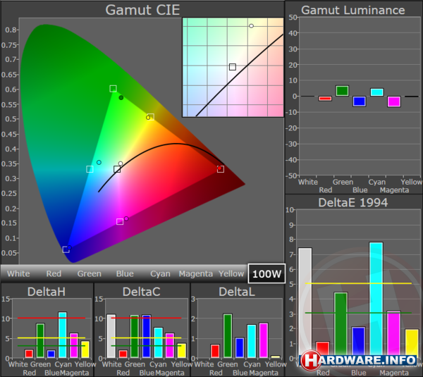 Onze kleurbereiktest wijst uit dat de kleuren dicht in de buurt komen van het sRGB kleurgebied. Helaas zijn er wel duidelijk afwijkingen zichtbaar bij de tussenliggende kleuren en groen. Groen en cyaan hebben waarschijnlijk zelfs niet te herstellen afwijkingen. De onderlinge helderheid van de kleuren is wel goed, met slechts een paar kleine uitschieters. De DeltaE 94 scores van groen en cyaan zijn net iets te hoog, de rest van de kleuren scoren mooi onder de acceptabele grens van vijf punten.