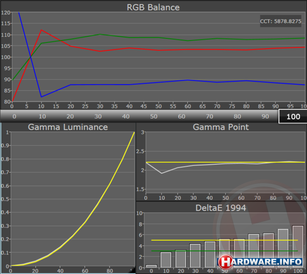 De kleurtemperatuur van 5878 Kelvin wijkt af van het gewenste 6500. Het beeld is daardoor meer oranje dan gewenst. De gemeten helderheid van het scherm is met 286 cd/m² goed. Door de lage helderheid van zwart is het contrast erg goed: 1144:1. Een contrast van 500:1 en hoger is normaal.