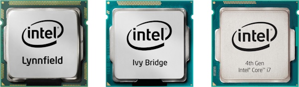 Socket 1156 (Lynnfield / Clarkdale), Socket 1155 (Sandy Bridge / Ivy Bridge) en Socket 1150 (Haswell) desktop processors naast elkaar: ze zijn exact even groot, maar vanwege anders gepositioneerde inkepingen passen de CPU's niet in elkaars socket.