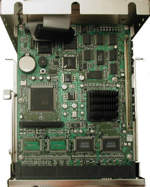 Als we de kast openen vinden we aan de bovenzijde een print en aan de onderzijde een aangepaste AT-voeding. De print is bijzonder compact, behalve een tweetal Promise Ultra 100 IDE RAID-chips (PDC 20265R) een Intel 960RD onder een koelblok. De Intel960 is een RISC-processor van Intel en is een zogenaamde PCI-bridge. De controller heeft aan de ene kant de twee Promise-chips en communiceert aan de andere kant met een LSI 53C895 SCSI-chip. De 960 RD beschikt over 16 MB cachegeheugen in een 72 pins SIMM-module.