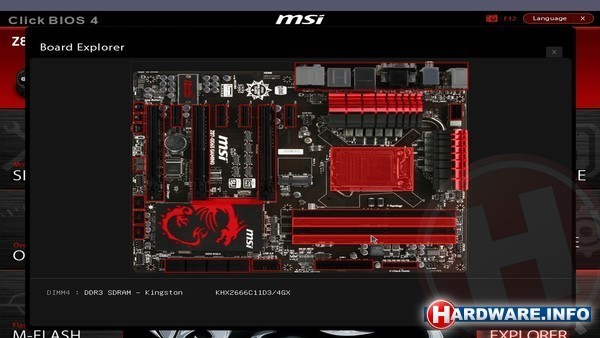 De nieuwe Haswell moederborden heeft MSI voorzien van de vierde generatie van haar grafische EFI-schil genaam Click BIOS. In de basis lijkt de BIOS erg op dit van de vorige generatie borden, met hier en daar een aantal kleine aanpassingen. Ook MSI begint steeds meer goed gebruik te maken van de grafische mogelijkheden van EFI, bijvoorbeeld door een mooie grafische methode om op het startscherm van de BIOS het bootdevice te selecteren. Helemaal mooi is de geïntegreerde hardwaremonitor, met duidelijk grafieken en scherma voor temperaturen, voltages en fan-snelheden. Ook mooi is de zogenaamde Board Explorer, waar je een goto van het bord te zien krijgt en alle onderdelen kunt aanklikken om de eigenschappen daarvan te bekijken en aan te passen. Het is een beetje gebaseerd op wat Gigabyte in haar vorige generatie grafische BIOS al deed, maar ook hier geldt: beter goed afgekeken dan slecht bedacht.