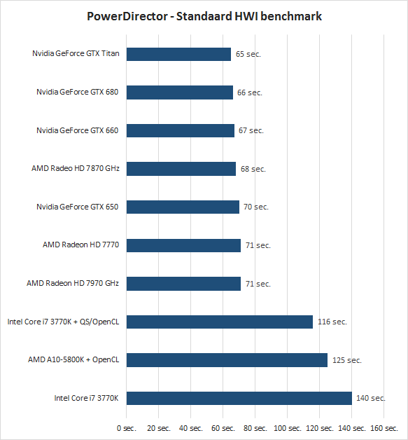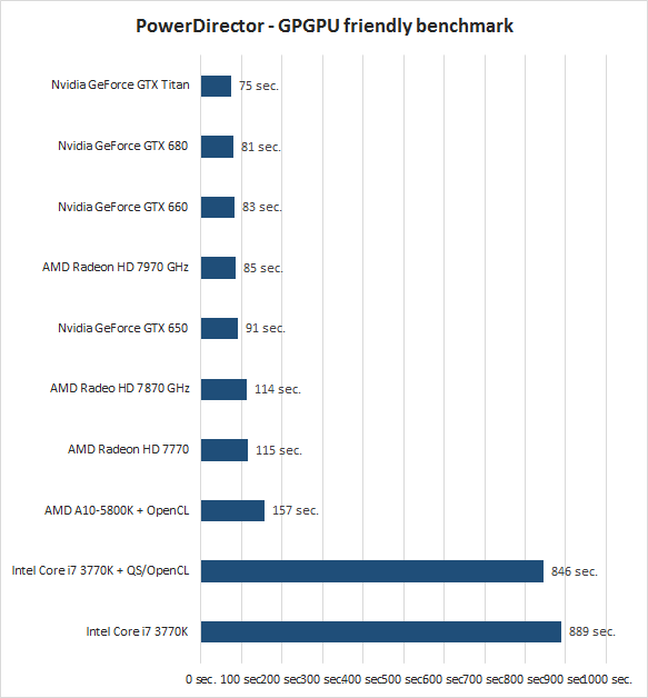 In een tweede PowerDirector benchmark pakken we hetzelfde project van één minuut, maar voeren we over de gehele lengte een zestal verschillende GPU-versnelde beeldeffecten toe over de video. De verschillende beeldovergangen blijven intact. De prestatieverschillen zijn nu enorm: de Core i7 3770K doet er 889 seconden (bijna een kwartier!) over om het project te renderen. De veel goedkopere AMD A10-5800K doet dit dankzij de snelle ingebouwde GPU in 157 seconden, ofwel ruim binnen drie minuten. Met de losse videokaarten gaat het nog sneller. Een Radeon HD 7770 en GeForce GTX 650 zetten met respectievelijk 115 en 91 seconden al mooie resultaten neer. Een Radeon HD 7970 GHz en GeForce GTX Titan doen het met 85 en zelfs 75 seconden nóg sneller.