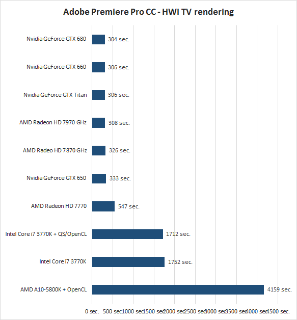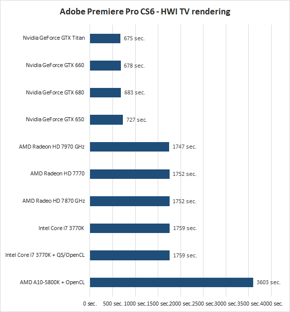 Op een Intel Core i7 3770K PC zonder losse videokaart duurt het 1759 seconden, ofwel bijna een half uur om de aflevering te renderen. Op de AMD A10-5800K is zelfs een uur nodig. Het plaatsen van een AMD videokaart heeft geen enkel effect. De verwerkingstijd blijft identiek. Een Nvidia-kaart zorgt echter voor een enorme versnelling. Een betaalbare GeForce GTX 650 brengt de rendertijd terug naar 727 seconden, ofwel een dikke 12 minuten. 41% van de oorspronkelijke tijd! Snellere Nvidia-kaarten snoepen er nog wel een paar seconden vanaf, maar niet noemenswaardig. Het moge duidelijk zijn: voor wie Premiere Pro CS6 gebruikt is een (willekeurige) Nvidia-kaart een verstandige investering.