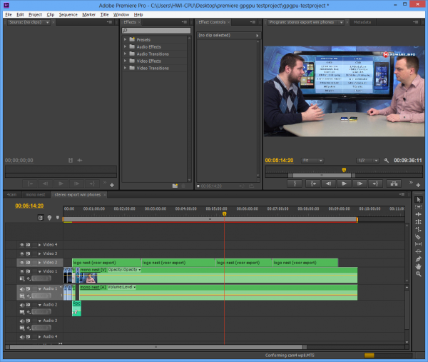 Als test openden we het project van een aflevering van Hardware.Info TV (de aflevering met de vergelijking tussen de Nokia Lumia 820 en HTC 8S) en exporteerden dit naar een 1080p H264 bestand, dat we gebruiken om Hardware.Info te uploaden bij YouTube. Hardware.Info TV bevat minimaal vier video-streams, elk onder meer voorzien van kleurcorrectie (GPU versneld!) en verder diverse titels, overgangen en andere effecten.