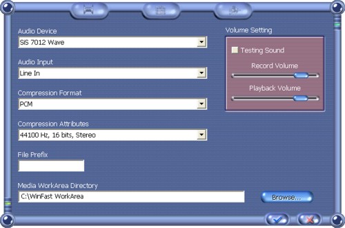 In het eerste scherm kan onder andere ingesteld worden naar welk formaat de WinFast software opnames moet maken. Als je de juiste codec geïnstalleerd hebt, kun je bijvoorbeeld probleemloos real-time naar MP3 opnemen, wat natuurlijk flink wat ruimte bespaart. (Ga hiervoor eens op zoek naar de Radium MP3 codec.)