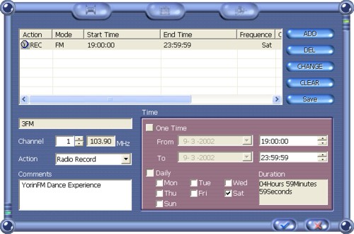 In het laatste configuratiescherm kunnen radio-opnames ingeprogrammeerd worden. Zowel eenmalige opnames als wekelijkse opnames zijn mogelijk. Als opnames zijn ingeprogrammeerd, zal de WinFast software volledig automatisch de gewenste radioprogramma's opnemen naar het gewenste audio-formaat. Erg slordig is dat het bij wekelijkse opnames niet mogelijk is om een opname te programmeren die over middernacht heen gaat. Dit is duidelijk een software-bug die Leadtek hopelijk binnenkort oplost.
