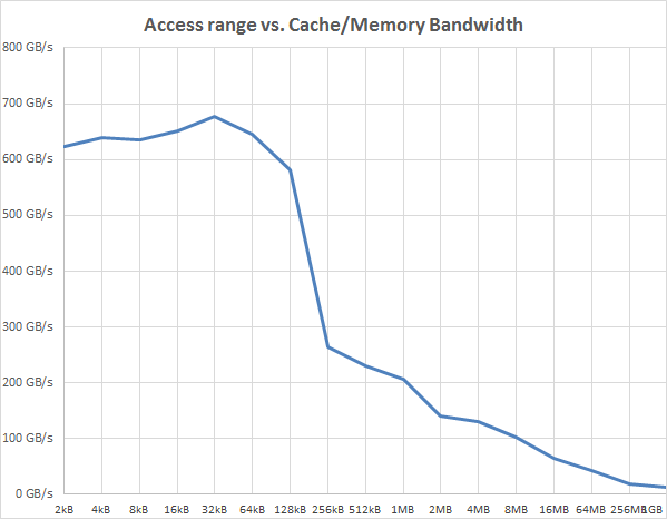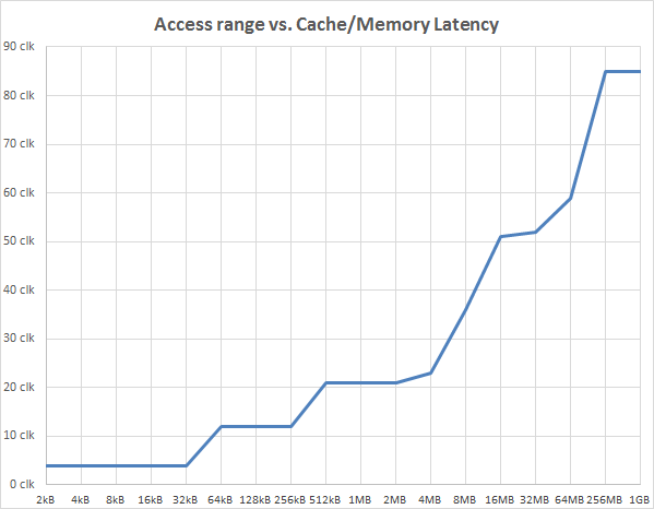We zien dat de latency in het L1-cache domein (tot 32 kB) 4 kloktikken is. In het L2-cache domein (tot aan 256 kB) zien we 12 klokslagen latency. De gemeten latency van de L3-cache ligt rond de 22 klokslagen. De latency van de nieuwe L4-cache zien we bij de metingen van 16, 32 en 64 MB en varieren tussen de 51 en 59 klokslagen. Het geheugen (256 MB en verder vanuit de CPU cores beredeneerd) is gemiddeld 85 klokslagen verwijderd. In de tweede grafiek zien we de cache- en geheugenbandbreedte, waaruit we duidelijk kunnen afleiden dat L1 en L2 zoals te verwachten het snelst zijn en L3 en L4 tussen deze waardes en die van het RAM-geheugen in liggen.