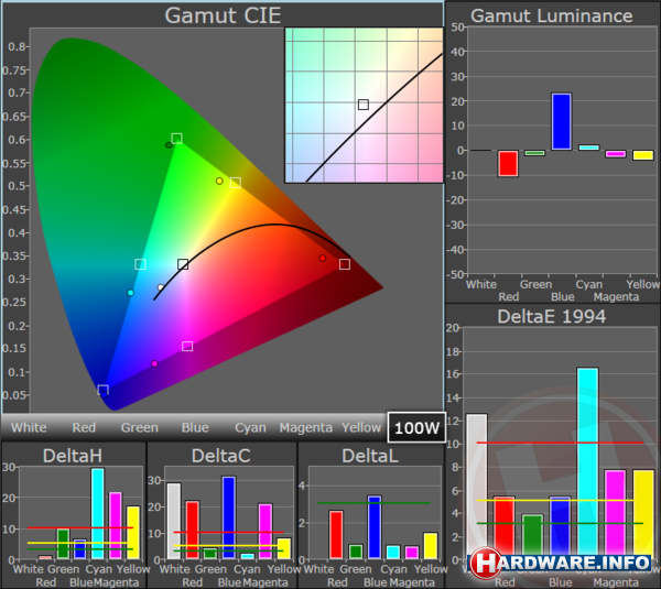 Het kleurbereik van deze monitor komt dicht in de buurt van het sRGB kleurgebied, maar de tussenliggende kleuren tonen forse afwijkingen. Rood zit ook net iets te ver naar binnen. De onderlinge helderheid van de kleuren toont kleine uitschieters van blauw en rood. De DeltaE 94 waardes tonen behalve groen geen waardes onder de acceptabele grens van 5 punten. De kleurreproductie van dit TN paneel is hierdoor niet slecht, maar ook niet bijster goed.