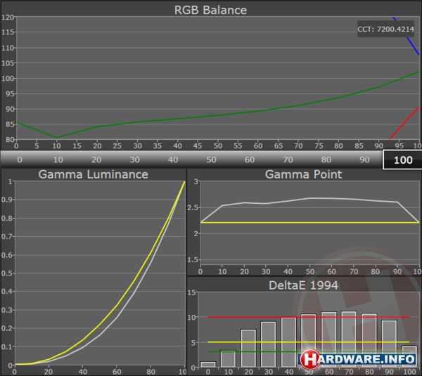 In het grijsverloop is goed te zien dat de basiskleuren afzonderlijk een afwijkend gamma hebben, en dat blauw oververtegenwoordigd is. De gammawaarde voor deze drie samen is met 2,61 veel te hoog, met 2,2 als uitgangspunt. Hierdoor is het beeld tussen 10 en 90 procent wit donkerder dan gewenst. Het verschil tussen 0 en 10 procent is hierdoor minder goed zichtbaar en het verschil tussen 90 en 100 procent wit is te groot.
