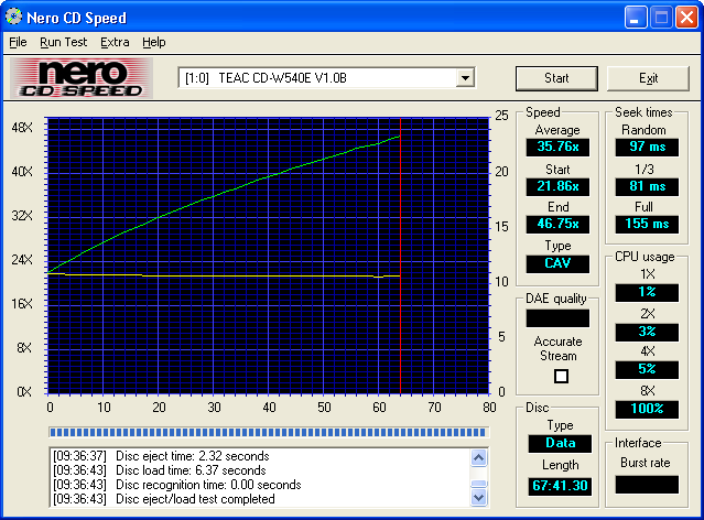 Gelukkig ging het lezen van CD’s weer uitstekend. Net als LiteOn belooft Teac een snelheid van 48X speed. Bij onze test data-CD werd deze snelheid ook bijna behaald. De CD-W540EK is tot nu toe de snelste brander die deze data-CD leest.