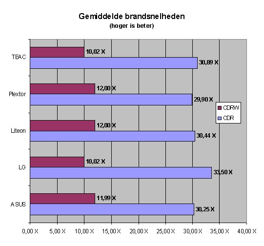 De LG brander springt er op het gebied van gewone CD’s branden direct als snelste uit. Helaas is hij op gebied van CDRW’s niet de snelste en moet hij zowel de ASUS als de LiteOn en de Plextor brander voor laten gaan.
