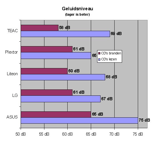 We hebben van elke brander de geluidsproductie gemeten. We hebben daarvoor de branders een bestaande CD laten doorzoeken en een CDR laten branden. In beide gevallen is de geluidsproductie gemeten met een dB-meter. De resultaten zijn grafische te zien in de onderstaanden grafiek. Opgemerkt moet worden dat de horizontale as (y-as in dit geval) lineair geschaald is, terwijl dit eigenlijk logaritmisch zou moeten zijn. Bij een logaritmische schaal zijn de onderlinge verschillen echter niet meer duidelijk genoeg. Daarom is gekozen voor een lineaire schaal.