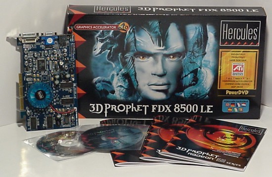 De belangrijkste nieuwe partner voor ATI is de bekende fabrikant Hercules. Hercules heeft zoals gezegd het alleenrecht op de All-in-Wonder videokaarten van ATI (zie Hardware.Info Magazine #1 voor een test), maar biedt ook 'normale' Radeon-kaarten aan. Een Radeon 8500 videokaart heeft Hercules nog niet in haar productengamma, maar een Radeon 8500LE is wél van de partij. Op bovenstaande foto zien we de Hercules 3D Prophet FDX 8500LE. Net als eerdere Hercules videokaarten, is ook de 3D Prophet FDX 8500LE stijlvol blauw van kleur. De kaart wordt geleverd met een duidelijke handleiding en op de bijgeleverde CD's vinden we verder nog het programma PowerDVD om DVD films af te spelen. Games levert Hercules helaas niet mee met de kaart.