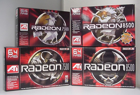 De ATI-kaarten die we van Jetway binnen kregen, zijn bijzonder te noemen. De naam Jetway is immers nergens op de doos van haar Radeon 7500 en Radeon 8500 terug te vinden! Jetways doel is duidelijk om de nieuwe kaarten er precies uit te laten zien als de vroegere varianten van ATI zelf. Ter vergelijking zie je op onderstaande foto boven de dozen van de Jetway Radeon-kaarten en onder de dozen van de oorspronkelijke ATI-kaarten. Er zijn aardig wat gelijkenissen te vinden: