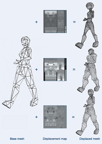 Onderstaande afbeelding toont nog een mooi voorbeeld van de veelzijdigheid van de nieuwe systemen. Programmeurs van 3D games zullen als ze dit zien haast niet kunnen wachten tot de nieuwe Matrox kaarten gemeengoed zijn. Links zien we een standaard 3D-mannetje opgebouwd uit een relatief klein aantal driehoeken. Door het aantal driehoeken nu te vergroten door Depth-Adaptive Tessalation en daarna compleet verschillende Displacement Maps te gebruiken, kunnen vanuit hetzelfde skelet compleet verschillende 3D poppetjes opgetrokken worden. Onderstaand voorbeeld toont dat door gebruik te maken van verschillende Displacement Maps alles van een alien tot een brede soldaat en een vrouw gecreëerd kunnen worden vanuit het oorspronkelijke 3D model.