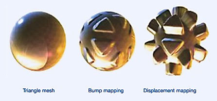 Belangrijk is om nog even te kijken naar het verschil tussen Bump Mapping en Displacement Mapping. Bij Bump Mapping kan de schijn van reliëf gecreëerd worden door de lichtinval per pixel verschillend te laten zijn. Bij Bump Mapping gebeurt er aan de daadwerkelijk 3D-opbouw van een object echter helemaal niets. Bij Displacement Mapping kan de daadwerkelijk opbouw wél gewijzigd worden en ontstaat er dus geen schijn van reliëf, maar ontstaan er échte reliëfwerkingen. Onderstaande afbeelding toont mooi wat je maximaal met Bump Mapping en Displacement Mapping kunt bereiken bij een 3D bol: