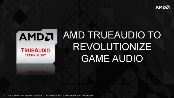 AMD TrueAudio is dus zoals geschreven een speciale audio DSP die is geïntegreerd in nieuwe AMD GPU's. Met de technologie wil AMD de kwaliteit van geluidseffecten binnen games flink verbeteren. Developers van audio-middleware kunnen van de DSP gebruikmaken om geluidseffecten die te zwaar zijn om op de CPU uit te voeren door de videokaart te laten berekenen.