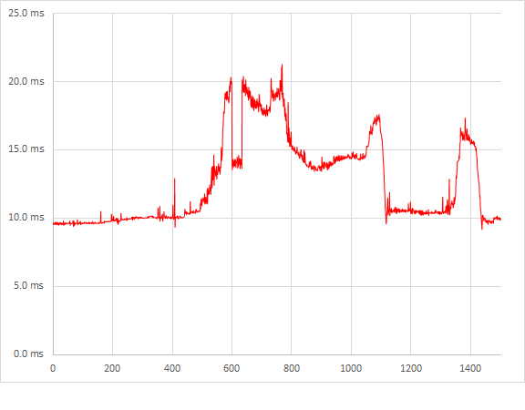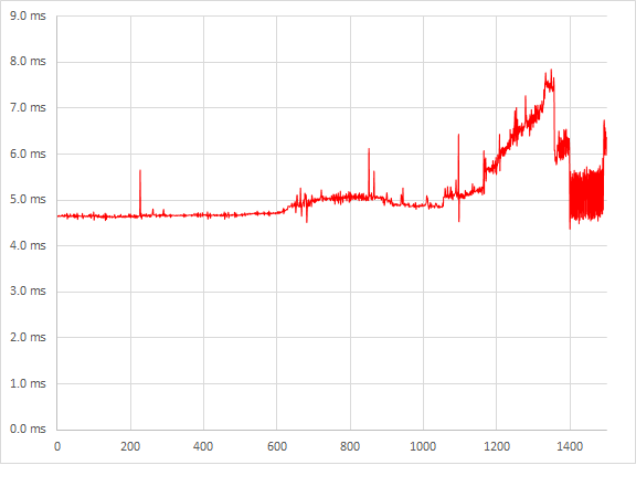 BioShock Infinite in Full HD met Ultra settings levert ruim 90 fps op, meer dan een GTX 780, net onder het niveau van de Titan. Overigens behaalden we met een 7970 hier nóg wat hogere scores. Laten we echter eerlijk zijn; deze game in Full HD resolutie is niet bepaald een uitdaging voor high-end kaarten. In de frametime grafiek zien we dat de benchmark zwaardere en minder zware momenten heeft. In alle gevallen zien we geen gekke pieken.