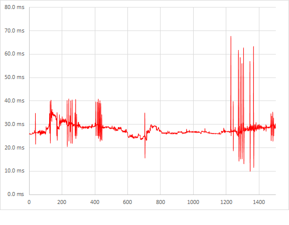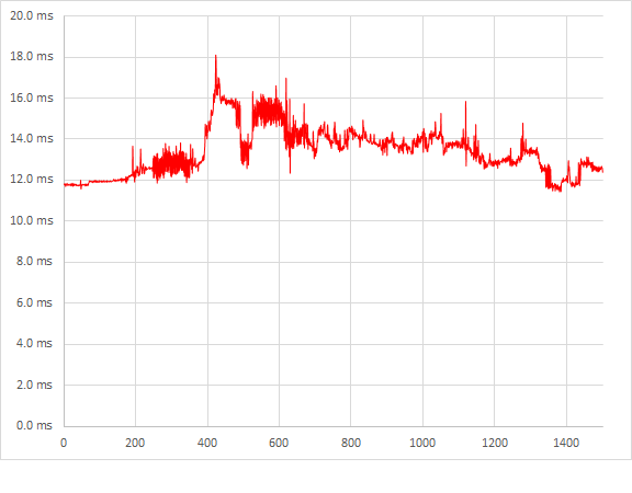 Drie schermen met medium settings loop met gemiddeld 80 fps en zeer strakke frametimes als een trein. 5760x1080 met Ultra kan eigenlijk nét niet; gemiddeld 36,5 fps is wat laag, wat we ook zien aan de frametimes. Overigens is de GTX 780 van hetzelfde laken een pak, met de Titan konden we deze instelling wel goed spelen.