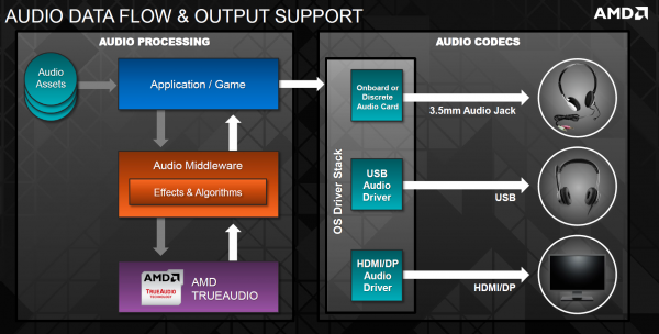 Een game maakt in de regel gebruik van middleware - een audio engine dus - om alle geluidsberekeningen te doen. Die middleware kan wanneer daarvoor geschikt gemaakt, de benodigde berekeningen laten uitvoeren door de AMD TrueAudio DSP's in plaats van door de CPU. Uiteindelijk komen alle berekende geluiden weer netjes terug bij de game, die het uiteindelijk doorvoert naar om het even wat voor type uitvoerapparaat; dat kan een losse of onboard geluidskaart zijn, een USB headset of een audiospoor binnen HDMI of DisplayPort verbindingen.