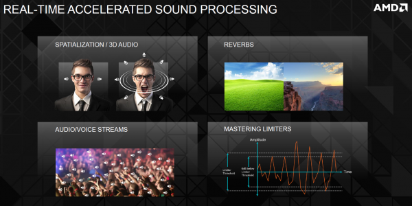 Een tweede belangrijke nieuwe technologie bij de nieuwe kaart, die zoals we twee pagina's terug zagen hardwarematig is verwerkt in de nieuwe GPU, is TrueAudio. Dit is een speciale audio DSP die is geïntegreerd in de Hawaii chip als ook in de Bonaire chip van de Radeon HD 7790 / R7 260X. Met de technologie wil AMD de kwaliteit van geluidseffecten binnen games flink verbeteren. Developers van audio-middleware kunnen van de DSP gebruikmaken om geluidseffecten die te zwaar zijn om op de CPU uit te voeren, door de videokaart laten berekenen. TrueAudio kan gebruikt worden voor zaken als 3D audio, omgevingseffecten of het verwerken en samenvoegen van zeer grote aantallen audiostreams.