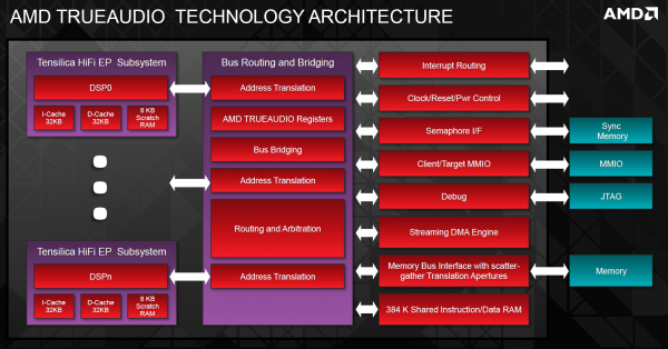 TrueAudio is hardwarematig gebaseerd op technologie van firma Tensilica. AMD geeft aan dat men meerdere (uit de wandelgangen begrijpen we drie) Tensilica HiFi EP DSP's in de chip heeft ondergebracht. Tensilica is overigens geen kleine jongen op dit vlak. Zo zitten Tensilica DSP's bijvoorbeeld verwerkt in veel chips voor smartphones, TV's of Blu-ray spelers. De firma heeft niet alleen veel ervaring met audio, maar ook met video. Als we de website van Tensilica mogen geloven, zijn de videodecoders binnen AMD's recente GPU's ook (gedeeltelijk) gebaseerd op Tensilica-technologie. Hoe het ook zij; in de wereld van audio-processing is het een bekende naam en is de architectuur van de HiFi EP DSP's ook bekend.