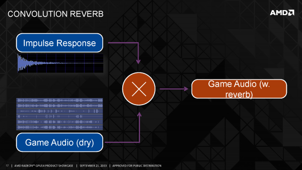 Een tweede voorbeeld kwam van AudioKinetic. Zij hebben een technologie om door middel van audio convolutiefilters realistischer audio-effecten binnen games te ontwikkelen. Dankzij dergelijke filters kan een realistische akoestiek van uiteenlopende gebouwen of andere locaties gesimuleerd worden. Volgens AudioKinetic hebben sommige soorten omgevingen, zoals een kerk met veel echo, convolutiefilters nodig die vele seconden duren, wat wanneer uitgevoerd op de CPU tot meer dan 15% belasting kan veroorzaken. Ook deze effecten kunnen door AMD's TrueAudio DSP uitgerekend worden. Deze audio-effecten zullen onder meer gebruikt gaan worden in de nieuwe Thief game, die volgend jaar uit moet komen. Maar veel andere game developers zijn er volgens AMD ook al mee aan de slag.
