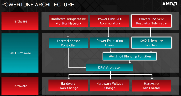 PowerTune maakt gebruik van temperaturen, verwacht verbruik en werkelijk verbruik als input en regelt op basis daarvan klokfrequentie, voltage en fan-snelheid.