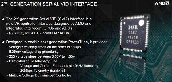 De interface die AMD gebruikt in de Radeon R9 290(X), en overigens ook in de R9 260X, zou volgens AMD iedere circa 10 microseconden voltages kunnen aanpassen. Er zijn naar verluidt 255 stappen tussen de 0 en maximaal 1,55 volt, waarbij de kleinste stappen 6,25 mV zijn.