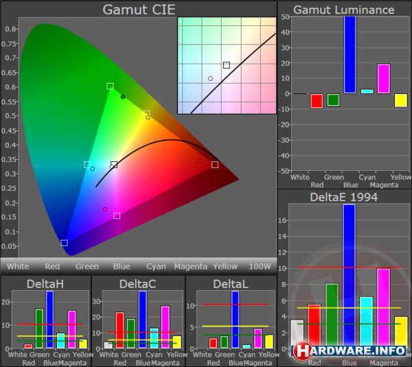 De kleurtemperatuur is met 7281 Kelvin iets blauwer dan het ideaal van 6500. Het beeld is daardoor net iets blauwer dan gewenst. De maximum helderheid van het scherm is met 411 cd/m² zeer goed. Door de lage helderheid van zwart is het contrast ook hoog met 978:1. Een contrast van 500:1 en hoger is normaal.