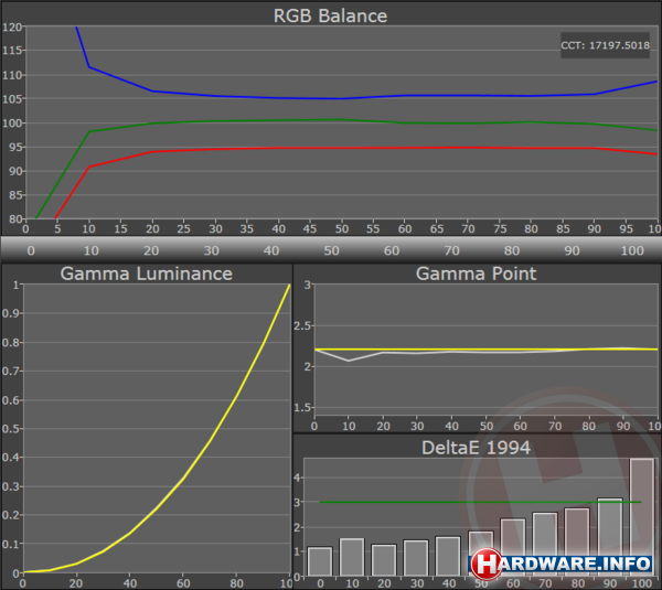 In het grijsverloop is goed te zien dat de basiskleuren afzonderlijk een redelijk goed gamma hebben, maar wel uit elkaar liggen. De gammawaarde voor deze drie samen is met 2,16 net iets te laag, maar nog goed tegenover het uitgangspunt van 2,2. Deze afwijking komt door een kleine daling bij 10 procent wit.