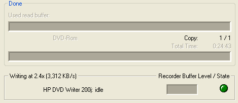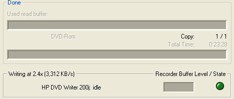 De dvd200i is interne 2e generatie DVD brander van HP en tevens het hart van de zojuist besproken dvd200e. Deze brander is in staat om zowel op 2.4XDVD speed een DVD+R te beschrijven als een DVD+RW te herschrijven. Als de DVD+RW niet meer geformatteerd hoeft te worden, duurt het branden van een DVD met 4.4 GB aan data, 23 à 24 minuten. De door ons gebrande DVD+RW had 23:28 minuten nodig, terwijl de DVD+R 24:43 minuten nodig had. Overigens wordt de DVD+RW geformatteerd voordat deze voor de eerste keer beschreven kan worden. Binnen enkele tientallen seconden is dit gebeurd.