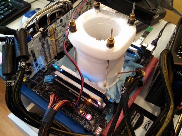 De overklok set-up van Splave.ROM waarmee het wereldrecord Ivy Bridge-E klokfrequentie werd behaald.