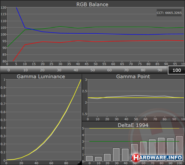 De kleurtemperatuur komt met 6656 zeer dicht in de buurt van het streven van 6500 Kelvin. Hierdoor heeft dit scherm bijna geen kleurzweem. De maximum helderheid van het scherm is met 366 cd/m² uitstekend. Door de lage helderheid van zwart is het contrast prima met 795:1. Een contrast van 500:1 en hoger is normaal.