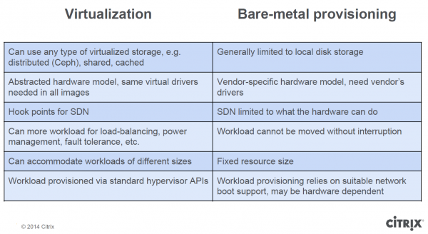 Een belangrijke vraag die Citrix in haar presentatie pareerde is of virtualisatie überhaupt wel nut heeft bij ARM-gebaseerde micro-servers die vermoedelijk niet snel genoeg zijn om meerdere virtuele instanties tegelijkertijd te draaien. Citrix gaf aan dat virtualisatie veel meer voordelen heeft dan de mogelijkheid om meerdere serverinstanties op één machine te draaien. Ook door een enkele instantie op een machine te draaien behoud je voordelen als eenvoudige (standaard) deployment, het eenvoudig kunnen gebruiken van gevirtualiseerde storage, het verplaatsen van workloads naar andere servers zonder interruptie, en zo verder.