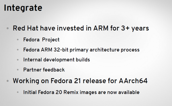 Naast Canonical was ook Red Hat aanwezig om de ondersteuning voor ARM te onderstrepen. Het bedrijf is echter nog (lang) niet klaar om ARM te gaan ondersteunen in Red Hat Enterpise Linux (RHEL), maar de eerste stappen zijn gezet. Binnenkort krijgt Fedora 21 als eerste Red Hat-product volledige ondersteuning voor ARMv8 (of AArch64 zoals men de architectuur bij Red Hat blijft noemen) en de technologie zal op een later moment doordruppelen naar RHEL. Overigens was Red Hat één van de bedrijven die mee heeft gewerkt aan het porteren van OpenJDK voor ARM.