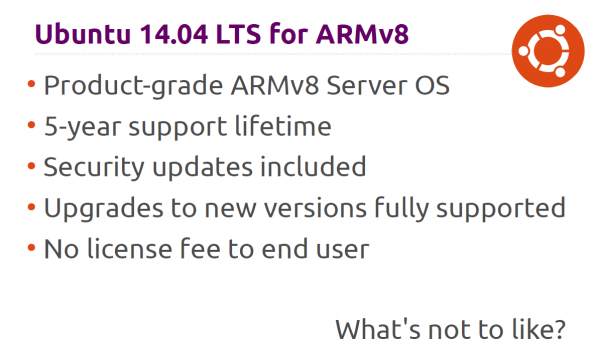 Naast de hardware is software natuurlijk minstens zo belangrijk. Met de komst van Ubuntu LTS 14.04 voor ARMv8 is er sinds kort voor het eerst een stabiele Linux-variant met volledige ondersteuning voor de 64-bit architectuur en dezelfde support-mogelijkheden als voor x86. Een afgevaardigde van Canonical, de ontwikkelaar van de Ubuntu-software, liet tijdens zijn presentatie weten dat de ARMv8 architectuur bij de ontwikkeling van Ubuntu inmiddels net zo belangrijk is als x86. Dat betekent dat de software "production grade" is, er net als voor de X86-versie 5 jaar volledig ondersteuning op wordt gegeven en dat alle beveiligingspatches voor Ubuntu LTS 14.04 zowel voor X86 als voor ARMv8 uitkomen.