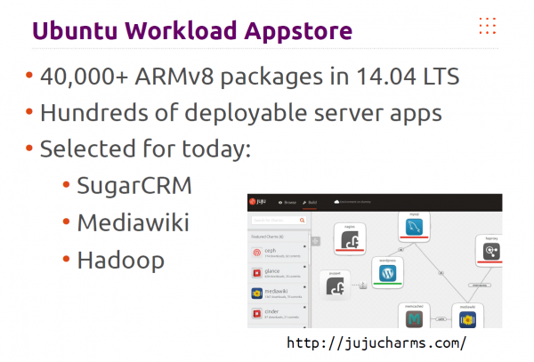 Ubuntu LTS 14.04 werd werkend gedemonstreerd op een cluster van de eerder genoemde AMCC X-Gene development borden. Via de Juju-software toonde Canonical onder meer SugarCRM (Apache/PHP/MySQL), MediaWiki en Hadoop workloads draaiend op ARM-hardware.