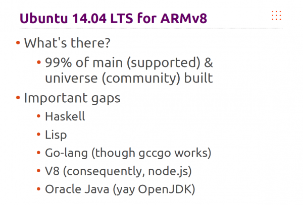 We schreven al dat er ruim 40.000 packages beschikbaar zijn: volgens Canonical is 99% van de packages die beschikbaar zijn in de x86-versie van Ubuntu LTS 14.04 ook beschikbaar voor ARM. De belangrijkste zaken die missen zijn compilers voor programmeertalen Haskell, LISP en Go, het V8/Node.JS framework om server-side Javascript te draaien en Oracle Java. Overigens is V8/Node.JS inmiddels wel geport naar ARM en is het als externe package te installeren en is er voor Oracle Java een prima alternatief in de vorm van OpenJDK dat wél beschikbaar is voor én stabiel is op ARMv8.