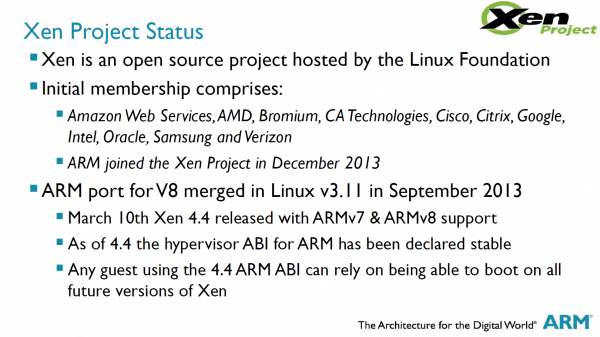 Citrix ten slotte gaf een presentatie over de Xen-hypervisor die met versie 4.4 nu ook volledige ondersteuning biedt voor ARMv8. De ARM-versie is volgens de ontwikkelaars volledig opgeschoond aangezien er voor de nieuwe architectuur geen rekening gehouden hoeft te worden met legacy hardware. De complete hypervisor bestaat volgens Citrix slechts uit een kleine 24.000 regels broncode, minder dan een zesde van de x86-variant.