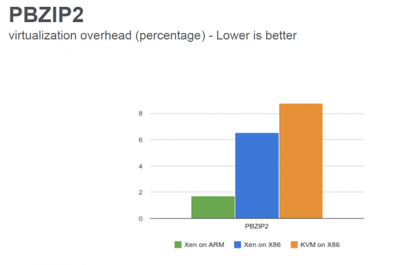 In een aantal grafieken toonde Citrix overigens aan dat Xen virtualisatie bij ARM minder overhead met zich meebrengt dan bij x86-servers. Het feit dat men als x86-platform echter een drie generatie oude Intel Westmere server gebruikte en we niet de absolute benchmarkscores te zien krijgen (enkel het percentage overhead), maakt dat deze informatie wat ons betreft vooralsnog weinig waarde heeft.