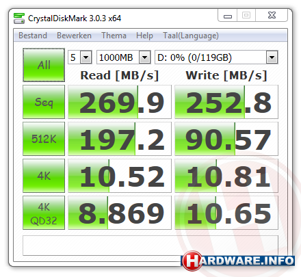 In de grafieken op de volgende pagina's zullen we zien dat in een praktijktest als deze de beloofde maximumsnelheden niet worden behaald. Dat het met een synthetische workload wél kan bewijst onderstaande screenshot die we hebben gemaakt met Crystal Disk Mark: