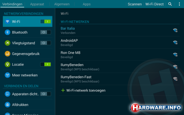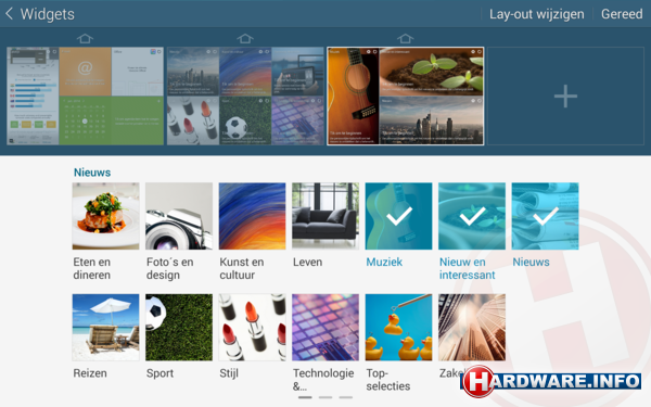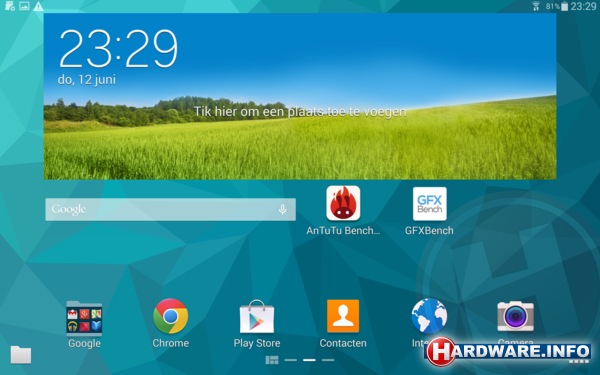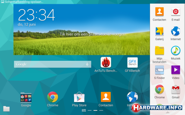 Beide tablets maken gebruik van Android 4.4 (Kitkat) voorzien van een nieuwe versie van Samsung’s TouchWiz skin. In vergelijking met vorige versies van TouchWiz lijkt Samsung nu minder applicaties standaard te installeren, wat ons betreft een verbetering. Qua look en feel volgt de nieuwe TouchWiz van de Tab S tablets de stijl die werd ingezet met de Galaxy S5. Dat betekent veel turquoise en groentinten, ronde toggles en veel ‘platte’ iconen. Veel van de menu’s zijn ook op de schop gegaan en zien er nu overzichtelijker uit. Onze eerste ervaringen met de tablets leren dat de interface redelijk snel aanvoelt en zonder haperingen werkt. Net als eerdere Samsung tablets bieden de Tab S modellen de mogelijkheid om twee apps naast elkaar te draaien, wat gezien de hoge resolutie van de beeldschermen ook écht meerwaarde biedt bij deze modellen. De nieuwe SideSync 3.0 software laat de tablets verbinding maken met Samsung telefoons, waarbij het mogelijk is het beeld van de telefoon op de tablet te tonen en zo bijvoorbeeld telefoongesprekken over te nemen op de tablet.