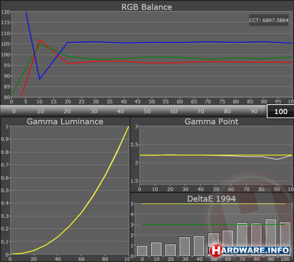 De kleurtemperatuur komt met 6898 dicht in de buurt van het streven van 6500 Kelvin. Hierdoor is het scherm maar net iets blauwer dan gewenst. De maximum helderheid van het scherm is met 260 cd/m² goed. Door de lage helderheid van zwart is het contrast uitstekend met 1128:1. Een contrast van 500:1 en hoger is normaal.