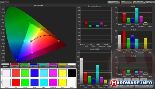 De kleurreproductie van het paneel is best goed. De kleuren zitten behoorlijk goed op hun plek in de sRGB-kleurruimte en vertonen relatief kleine afwijkingen. Het gamma is gemiddeld wel veel te hoog, wat resulteert in een plaatje dat er behoorlijk donker uitziet.