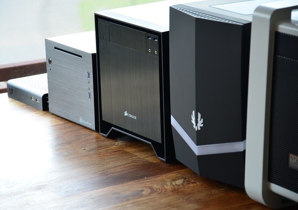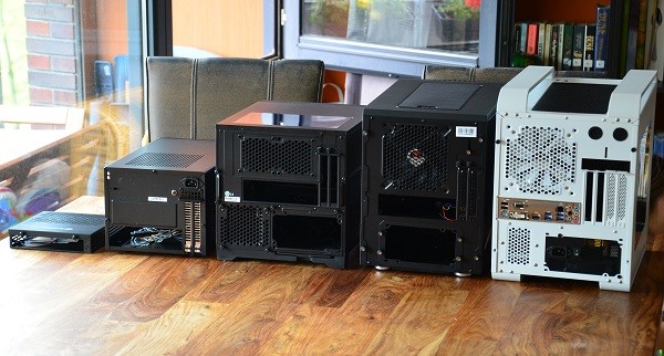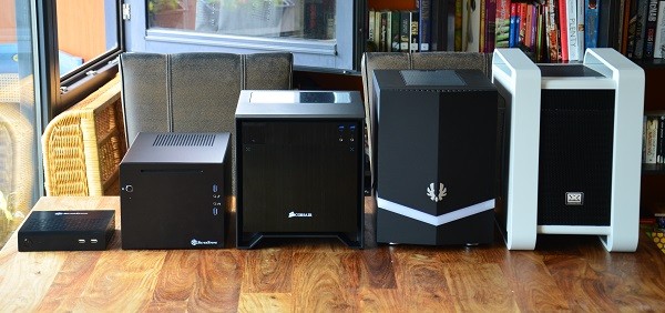 Van links naar rechts: SilverStone PT13, SilverStone Sugo SG08-Lite, de Corsair 250D, de BitFenix Colossus mini-ITX, en de Xigmatek Aquila White Window.