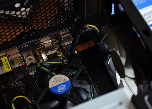 Het voordeel van de plaatsing van de voeding en de drives is dat de meeste kabels onderin de behuizing blijven, en dus niet echt weggewerkt hoeven te worden. Enkel de zaken die op het moederbord aangesloten moeten worden, en de prik voor de grafische kaart zal naar boven gevoerd moeten worden. Corsair heeft best wat aandacht besteed om te zorgen dat het resultaat van een build er goed uit ziet, zo kan je de CPU powerkabel via een handige goot uit het zicht naar achteren leiden.