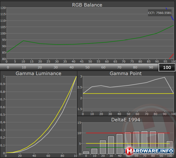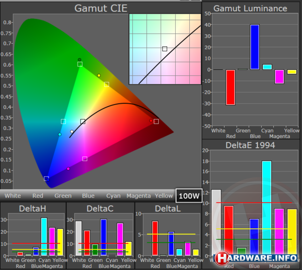 De kleuren van het scherm zitten bijna op de juiste plek en vallen daardoor netjes in het sRGB kleurgebied. De tussenliggende kleuren laten echter wel kleurverschuivingen zien. Mede door afwijkingen in de onderlinge helderheid van de kleuren, scoort geen van de kleuren, behalve groen, netjes onder de acceptabele grens van vijf DeltaE 94 punten. Lager is bij deze puntentelling beter.#