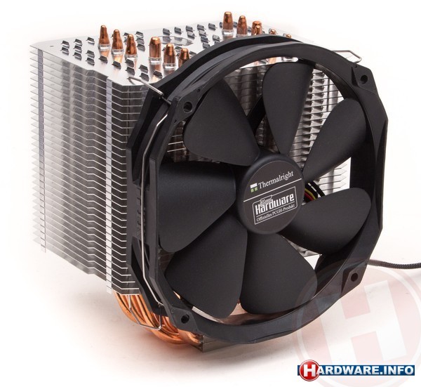 Het koelblok is identiek aan de normale Thermalright Macho Rev A. Een zestal 6mm heatpipes brengt de warmte van de baseplate over naar een potig koelblok. Perforaties in de lamellen zouden er voor moeten zorgen dat de warmteafdracht wordt geoptimaliseerd.